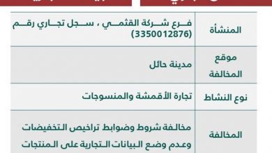 شهرت وزارة التجارة بفرع شركة تختص في تجارة الأقمشة والمنسوجات بمدينة حائل إثر صدور حكم قضائي بإدانة المنشأة بمخالفة نظام…
