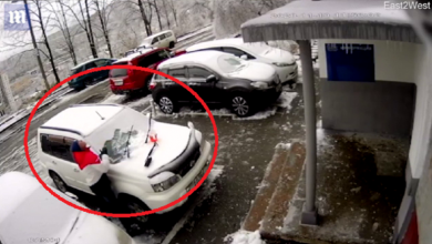 توقف رجل روسي عن تنظيف سيارته ونظر إلى أعلى، ليشاهد وكأن الموت يهبط عليه من أعلى في صورة لوح بناء…