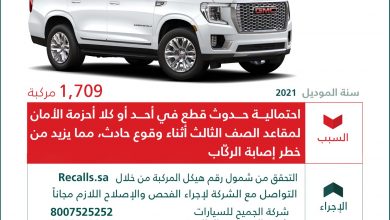 استدعت وزارة التجارة 3,140 سيارة جمس يوكون وشفروليه “سوبربان-تاهو” وكاديلاك اسكاليد موديلات 2021، وأكدت على أهمية التحقق من شمول الرقم…