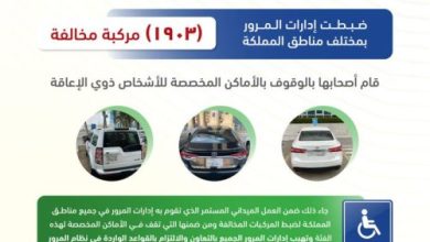 قامت إدارات المرور بحملة مرورية لضبط المركبات المخالفة بالوقوف في مواقف ذوي الاحتياجات الخاصة. ونتج عن الحملة ضبط 1903 مركبة قام أصحابها…