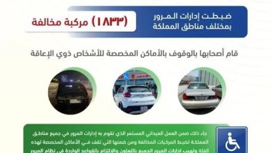 قامت إدارات المرور بحملة مرورية لضبط المركبات المخالفة بالوقوف في مواقف ذوي الاحتياجات الخاصة. ونتج عن الحملة ضبط 1833 مركبة قام…